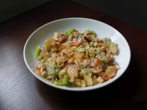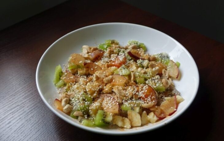 Przygotowanie: płatki zalej wrzątkiem na ok. 60 sekund, następnie odsącz wodę. Owoce pokrój w kostkę i dodaj do płatków razem z orzechami, sezamem i olejem kokosowym. Całość posyp cynamonem lub przyprawą do piernika.
